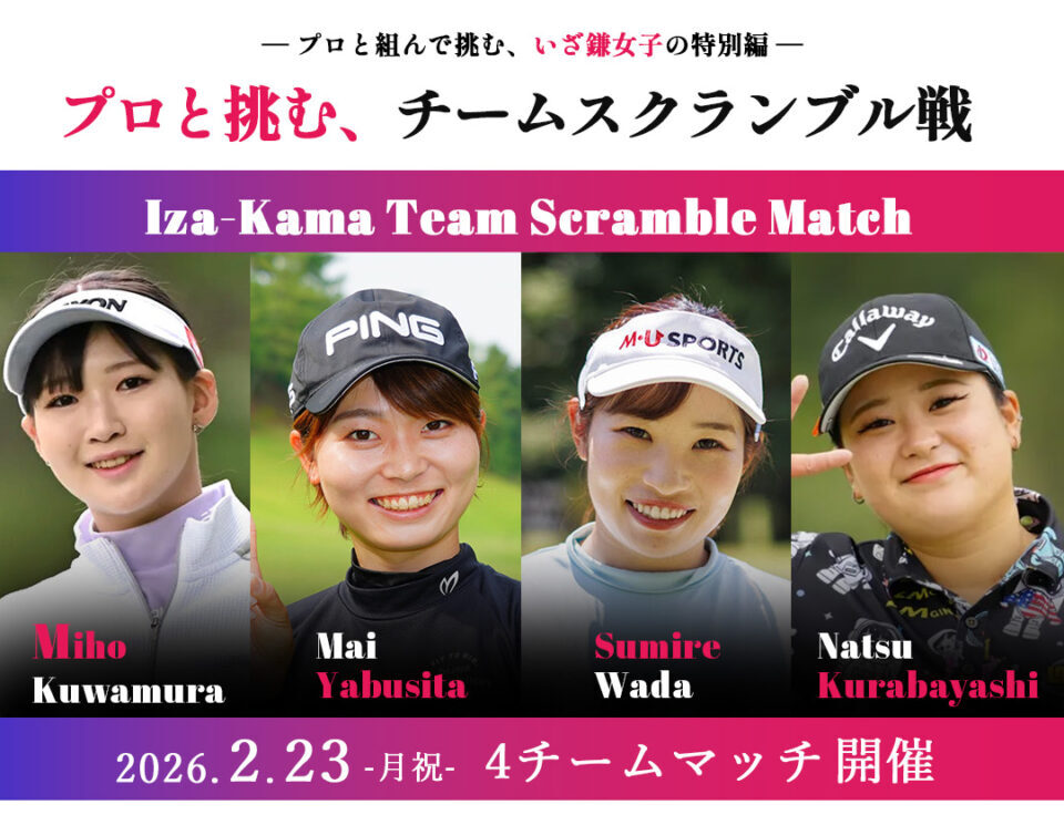 いざ鎌女子による特別臨時イベントとして、女子プロとアマチュアが同じチームで競う「チームスクランブル戦」を開催します。 プロ1名+アマチュア3名の4名1組で競技を行い、前半・後半で帯同プロが交代する特別ルールを採用。 |
